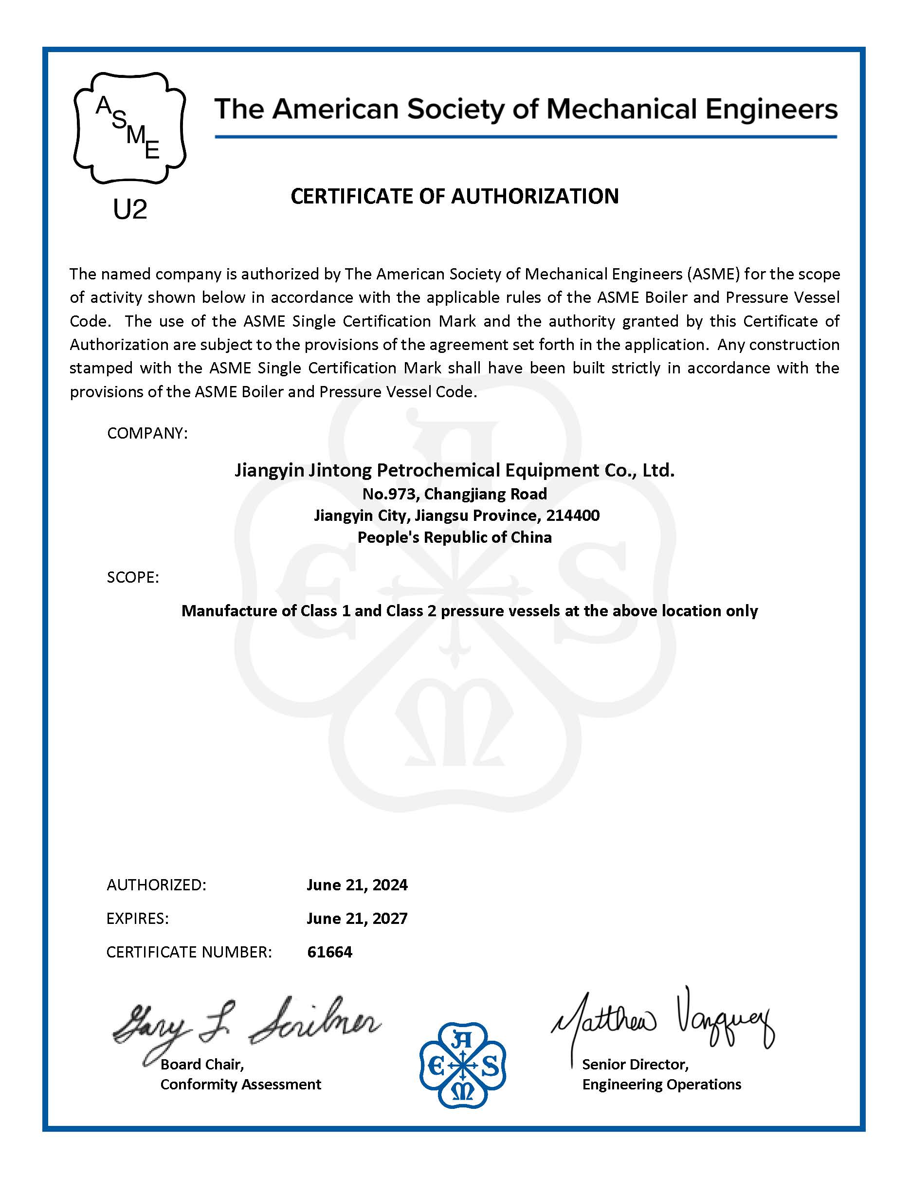 企業資信等級為AAA,是江蘇省國家高新技術企業。公司自1996年起開始按ISO9000要求建立質量管理體系,于1998年獲得質量管理體系認證。并具有特種設備壓力容器規則設計許可資質、大型高壓容器A1和超高壓容器A6制造許可資質,壓力管道元件A、B級制造資質,江蘇省節能型熱交換成套裝備工程技術研究中心、無錫市金屬管道配件工程技術研究中心。